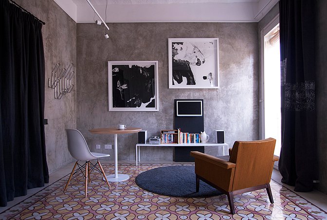 Az apartman, amit most “kiveszünk”, a végtelenségig leegyszerűsített elegancia és a merész, modern stílus nyerő kombinációja. Az építész tulajdonos – akinek a stúdiója ugyanebben a házban van -, újraértelmezte az épület XVIII. századi gyökereit, a történelmi hagyományos stílust, és biztos ízléssel keverte ipari jellegű anyagokkal és a saját maga által összegyűjtögetett modern bútorokkal, kortárs képekkel és dekorációval. A kontrasztokra épített, és milyen jól tette!