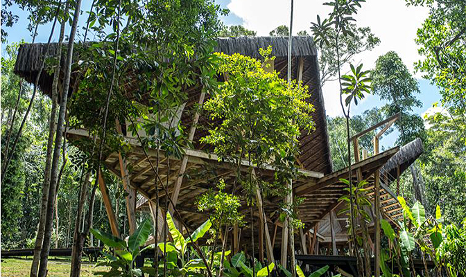 A lombház teljes egészében kézi munkával, újrahasznosított fából, cölöpökre épült. A minden oldalról nyitott “házban” biztosított a természetes légkondicionálás és hihetetlen a kilátás a dzsungelre.