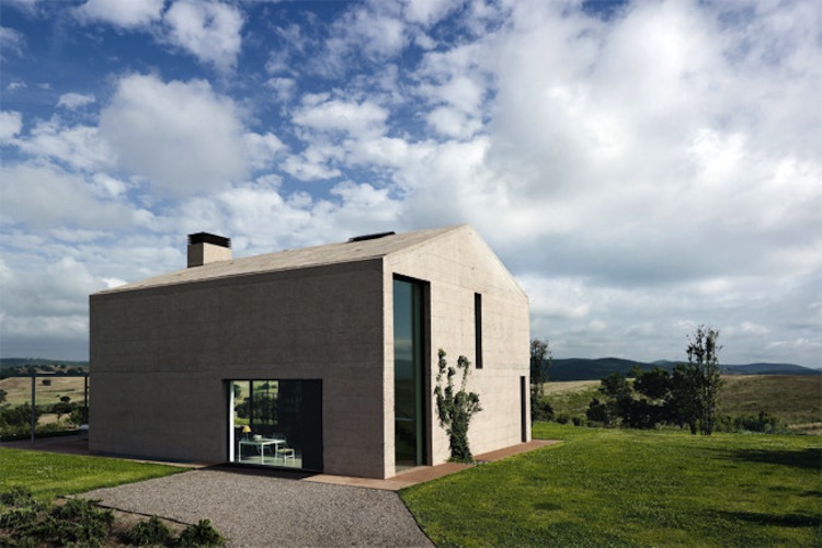 Ilyen a nyaralója is a toszkán lankák között, olyan, mintha egy gyerek rajzolta volna a formát, egyszerű tető, falak, ablakok… Hatalmas ablakok: olyanok, mint “egy-egy óriásképernyő”. A kint és a bent alig-alig határolódik el. Az üvegvitrin sem zavarja a fény beáramlását, és a látvány élvezetét.