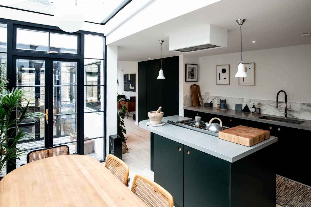A London közelében lévő ház kibővítésével főképp a konyhát-étkezőt nagyobbították meg, és állították kontrasztba a ház többi részével. A látványos osztott fémablakoknak, a sok fénynek, az üvegtetőnek, a kis belső udvarnak, és persze a már előbb is említett kontrasztosságnak köszönhetően elég látványosra sikeredett, igaz?