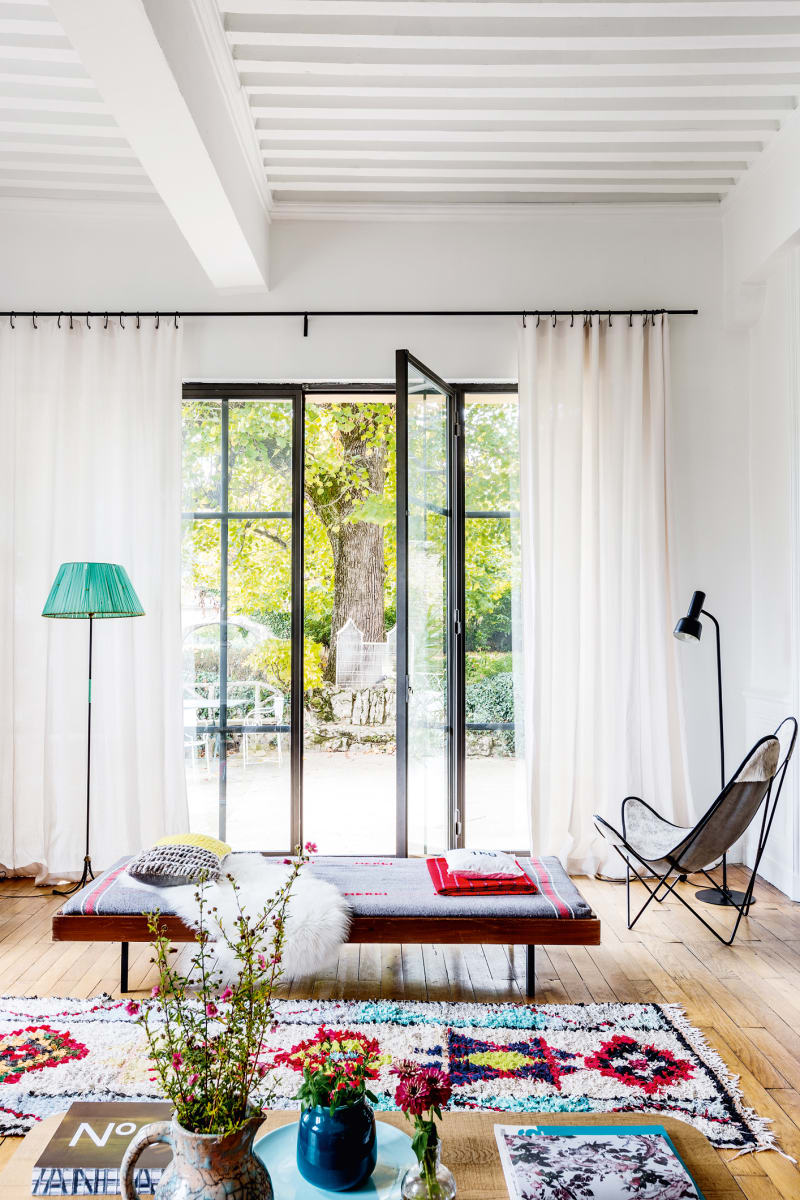 Marine Palayer francia fotográfus (és állatmentő) kastélyából már mutattam egy szuper, színes, eklektikus részletet, ígérve, hogy mutatok még, mert érdemes látni a többi helyiséget is. Ezen a lakáson érezni, hogy lelke van, hogy itt valódi hús-vér emberek laknak, hogy a tárgyak, amik körülveszik őket nem a divat kedvéért kerültek oda, hanem mert jelentőséggel bírnak. Vannak igazán szép design tárgyak és bútorok, vannak régi kincsek, bolhapiaci kacatok; és nagyszerűen megférnek egymással! Annyira szeretném, ha itthon is el bírnánk szakadni a (rendkívül unalmas és lelketlen/élettelen) “minden-mindenhez megy-minden vadonatúj (ezért pozdorjából van) -minden úgy néz ki, mint egy szállodában-mindenről (még a képekről is…) elsőre szembeötlő, hogy melyik áruházláncból való” megoldásoktól. És ne mondja nekem erre senki, hogy ez azért van így, mert nincs elég pénzünk. Ez nem pénzkérdés, mert nagyon sok beszerzési helyen lehet ám olcsón jópofa dolgokat találni. Az igaz viszont, hogy lényegesen nagyobb macera így berendezkedni, hisz időt és energiát kell rá szánni és kutatgatni és várakozni egy-egy odaillő szőnyegre vagy lámpára, emlékezni kell az otthon már meglévő tárgyakra, és gondolatban elhelyezni az épp kiválasztottat, összeilleszteni a sokféle stílust. Na, hát ez tényleg nem könnyű. Kell hozzá bátorság, stílusérzék és persze idő és energia. (A pénzt szándékosan nem emelem ki, mert a hotel sztájlhoz is kell…) Íme tehát egy biztos ízléssel összeállított, bátor, színes világ, gondolat- és zsigerébresztőnek: