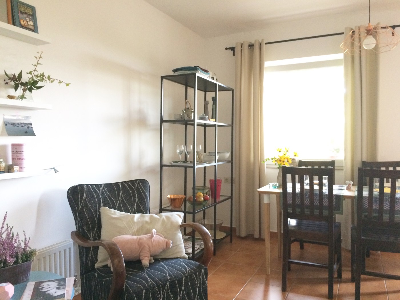 A konyhaszekrényekkel már más volt a helyzet, de aztán – alacsonyabb szinten tartva a költségvetést -, inkább egy nagy masszázst és egy részleges ráncfelvarrást kapott. Az alsó szekrényeket lefestettük, a felső szekrényeket leszedtük, helyettük az Ikeából vásároltunk egyszerű, fehér frontú faliszekrényt, igyekezve kihasználni a teljes belmagasságot. Mellé egy fekete, üvegajtós változat is került, ahol az üvegholmik, csészék kapnak helyet. Az oldalsó falra nem is került vissza a szekrény, csak egy keskeny polcocska, hogy kéznél legyen a gyakrabban használt ez meg az. Így sokkal világosabb lett és tágasabbnak hat a tér. Kacérkodtunk a falicsempe lefestésével is, a képeket elnézve pedig nem kizárt, hogy a következő tavasszal ecsetet ragadunk és megcsináljuk mégis.